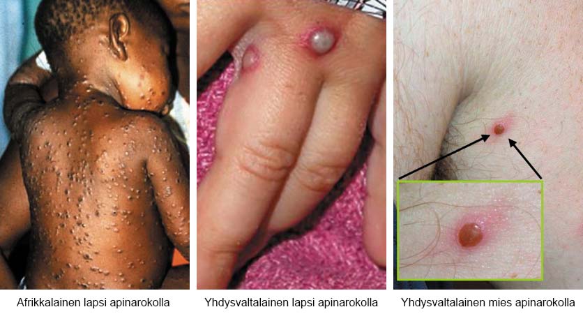 Vuoden 2003 tapauksen yhteydessä raportoiduista ihovaurioista oli saatavilla vain vähän kuvia, mutta alla on kuvattu kaksi yhdysvaltalaista tapausta ja vertailun vuoksi kuva apinarokkotapauksesta Afrikassa. Lukija voi päätellä itse, mutta nuo ihoreaktiot eivät näytä vähääkään vertailukelpoisilta mielestämme.