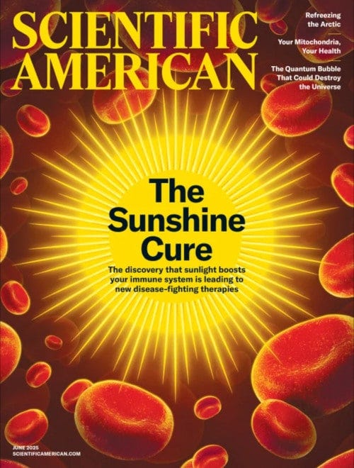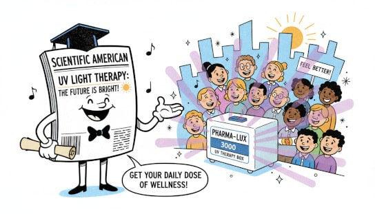 Nyt, Scientific American –lehden ollessa se ostettu ja myyty, farmaa puskeva, agendaa edistävä propagandarääsy, joka se valitettavasti nyt on, artikkeli päätyy luonnollisesti pohtimaan, onko olemassa jotain scifimpää (ja kalliimpaa) tapaa saavuttaa auringonvalon hyödyt ilman, tiedäthän, että tarvitsee varsinaisesti mennä ulos aurinkoon (ilmaiseksi). Tästä syystä Kathy Youngin hieno UV-valolaite avaa ja päättää artikkelin.