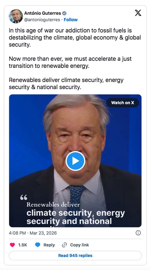 Siitä laajenee lähes varmasti ilmastonmuutos/uusiutuva energia -narratiivi, jossa väitetään, että öljyn hinta on ”liian epävakaa” ja riippuvuutemme fossiilisista polttoaineista ”aiheuttaa kuolemaa ja tuhoa”, ja että ilmastonmuutos on ”kansainvälinen turvallisuuskriisi”.