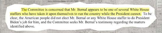 Komitea on huolissaan siitä, että herra Bernal näyttää olevan yksi useista Valkoisen talon työntekijöistä, jotka ovat ottaneet tehtäväkseen johtaa maata sillä aikaa, kun presidentti ei voi. Selvyyden vuoksi, amerikkalaiset eivät valinneet herra Bernalia tai ketään Valkoisen talon työntekijää tekemään presidentti Bidenin työtä hänen puolestaan, ja komitea pyytää herra Bernalin todistajanlausuntoa yllä mainituista asioista.