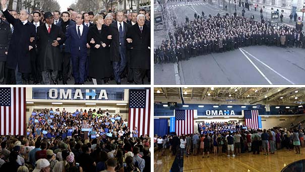 Tai kun maailman lehdistö yritti saada meidät vakuuttuneeksi siitä, että vapaan maailman uljaat johtajat yhdistyivät urhokkaasti käsikynkkään osoittaakseen sitoutumisensa sananvapauteen johtamalla Pariisin yhtenäisyysmarssia Charlie Hebdon vuosipäivänä?