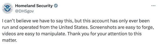 Yllättäen jopa Yhdysvaltain kotimaan turvallisuusviraston oli twiitattava vakuuttaakseen, että se itse asiassa on yhdysvaltalainen sen jälkeen, kun ilmeisen muokatut kuvakaappaukset viitaten siihen, että tili oli ulkomailla, levisivät.