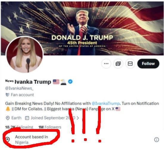 Näyttää siltä, että kyseinen Trumpia rakastava Ivanka-fani sijaitsee MAGA:n tukikohdassa . . . Nigeriassa?