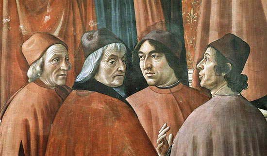 Yksityiskohta Domenico Ghirlandaion freskosta Enkelin ilmestys Sakariaalle (1486-1490) Tornabuonin kappelissa Firenzessä: humanistit vasemmalta oikealle Marsilio Ficino, Cristoforo Landino, Angelo Poliziano ja Demetrio Calcondila tai Gentile de’ Becchi.