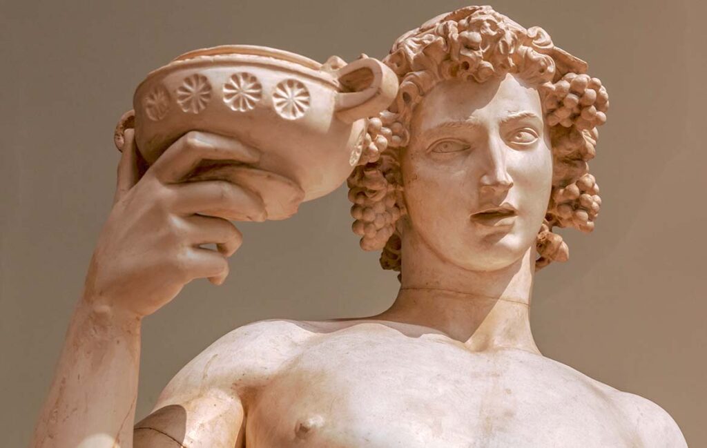 Dionysos, kreikkalainen tanssin, laulun, viinin ja ”muuttuneiden tajunnantilojen” jumala.