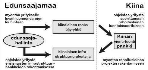 Angolan hallitus käyttää Kiinan luottolimiittejä öljypohjaisilla takuilla investointien rahoittamiseen. Nämä investoinnit eivät kuitenkaan edusta suoraan Angolan hallitukselle toimitettuja rahasummia, vaan pikemminkin kiinalaisille julkisille yrityksille tarvittavien varojen tarjoamista infrastruktuurin ja teollisuushankkeiden kehittämiseen vastineeksi öljystä ja mineraaleista. [. . .] Kiinan investoinnit saadaan takaisin louhitusta ja tuontiöljystä.