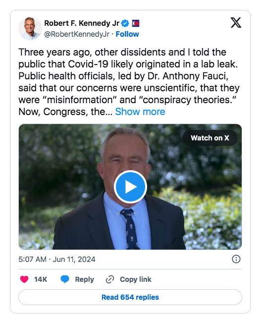 Ja eilen RFK Jr vakuutteli siitä osana presidentinvaalikampanjaansa: