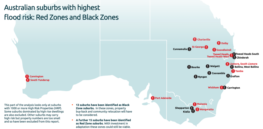 Tutkimuksen mukaan suurimman riskin muodostavat jokien tulvat, äkilliset tulvat ja pensaspalot tunnistettiin muiksi tärkeimmiksi vaaroiksi, jotka vaikuttivat kiinteistöjen ”vakuutuskelvottomiksi” tulemiseen.