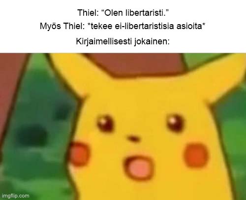 Katso julkaisun Wired ”The Libertarian Futurism of Silicon Valley Billionaire Peter Thiel – Piilaakson miljardööri Peter Thielin libertaristinen futurismi” tai ”The Libertarian Logic of Peter Thiel – Peter Thielin libertaristinen logiikka” tai julkaisun Mannwest ”Peter Thiel: The articulate libertarian – Peter Thiel: hyvin itseään ilmaiseva libertaristi” saadaksesi joitain erinomaisia esimerkkejä tästä ilmiöstä. Nauti sitten Reason-lehdelle (jolle valheellisen libertarismin käsite ei ole vieras) ja sen järkyttyneen pikachun ilmeen artikkelille ”Wait, Wasn’t Peter Thiel a Libertarian? – Hetkinen, eikö Peter Thiel ollut libertaristi?” nauramisesta.