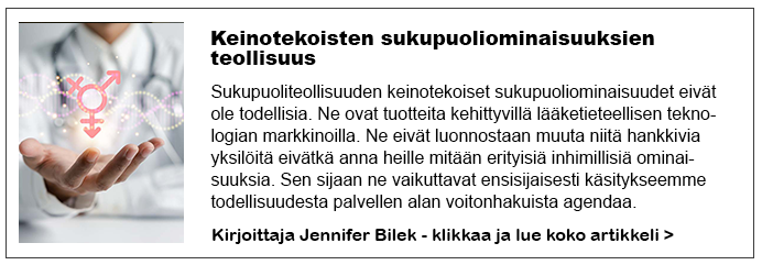 Tähän kulttiin kiinni joutuneet lapset ja nuoret aikuiset tarvitsevat selvästi lääkinnällistä huomiota loppuelämänsä ajan. He tarvitsevat, samoin kuin samaan sukupuoleen viehättyneet yksilöt, lisääntymisteknologiaa omia lapsia saadakseen. Lasten asemointi indoktrinoituina uskomaan, että he voivat valita sukupuolensa teknologian avulla, LGB:n kansalaisoikeuslipun alla, on keino tarjota oikeudellinen rakenne lisääntymissukupuolen purkamiseen, ja se myös tuottaa laajemman markkinointipiirin sekä koekentän näille lisääntymisteknologioille.