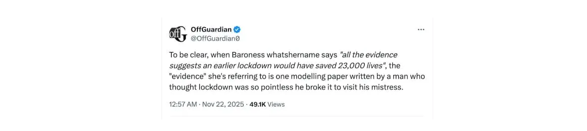 ”Professori Ferguson” on, älkäämme unohtako, Neil Ferguson, ”virusmallintaja” (vai pitäisikö sen olla ”liberaali Lysenko”?) Imperial College London -yliopistosta, joka tuotti tietokoneella mallin, jonka mukaan 500 000 brittiä olisi tuomittu hautaan, ellei UK:n hallitus asettaisi kansallista sulkutilaa. Ferguson on sittemmin perunut väitteensä ja kiistää nyt vaatineensa sulkua lainkaan, mutta on pidettävä mielessä, että hänen takinkääntönsä tapahtui sen jälkeen, kun hän jäi kiinni UK:n sulkurajoitusten rikkomisesta suhdetta naimisissa olevan rakastajansa kanssa jatkaakseen.