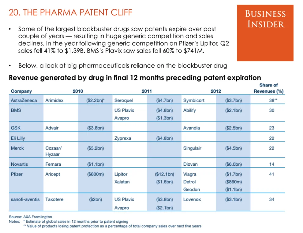 Ongelma alkaa häämöttävästä taloudellisesta uhasta, jonka 20 suurinta lääkeyhtiötä kohtaavat: tästä hetkestä vuoteen 2030 asti 180 miljardin dollarin myynnit ovat vaarassa. Tämä patenttijyrkänteeksi (engl. patent cliff) kutsuttu uhka on lääketeollisuudessa säännöllisesti toistuva ongelma. Iso Farma on jo pitkään ansainnut rahansa saavuttamalla patenttiyksinoikeuden tietyille lääkkeille, mikä monopolisoi kaikki niistä saadut mahdolliset voitot rajalliseksi ajaksi. Kun tämä patentin yksinoikeus päättyy, lääke vierii pää edellä ”patenttijyrkänteeltä”, ja kymmenien miljardien dollarien tulot ovat vaarassa.