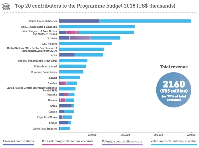 WHO:n rahoituslähteet vuonna 2018. Kuvalähde: Maailman talousfoorumi/www.weforum.org/agenda/2020/04/world-health-organization-what-it-does-how-it-works/